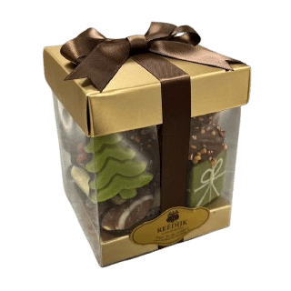 Dit luxe, transparante kubusdoosje is gevuld met een assortiment kerstchocolade.