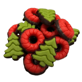 Onze kerstboompjes en kransjes van zachte, amandelmarsepein zijn gedoopt in rijke pure chocolade voor een perfecte balans tussen zoet en intens.