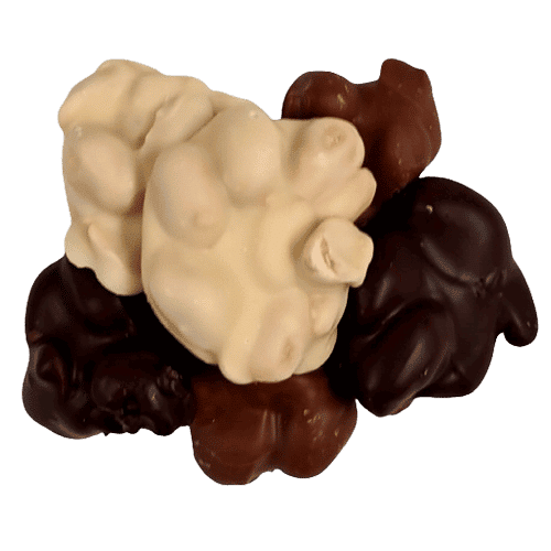 Verkrijgbaar in melkchocolade, witte chocolade of pure chocolade.