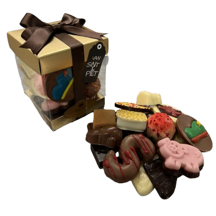 Dit luxe, transparante doosje is gevuld met een feestelijk assortiment aan Sintchocolade.
